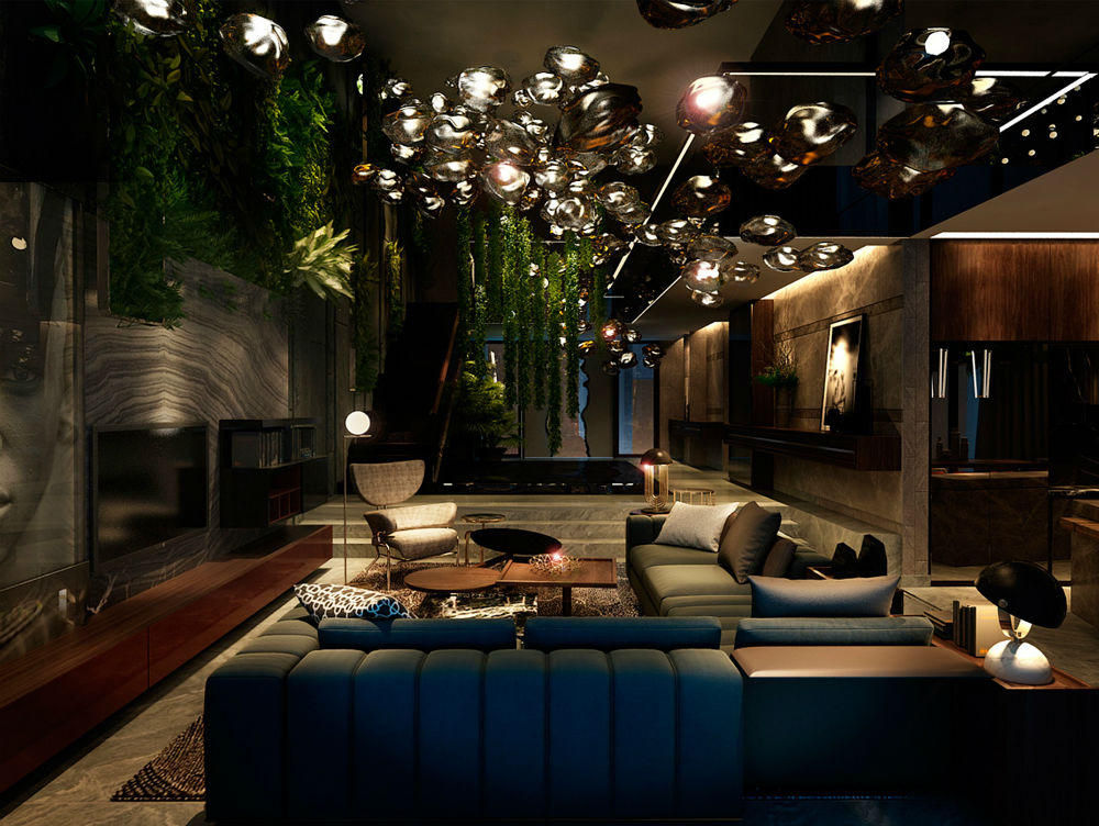 Tương đồng với phong cách ngoại thất nhiệt đới hiện đại, chất liệu nội thất được lựa chọn theo phong cách Bắc Mỹ sành điệu với tông nâu trầm, ghi xám chủ đạo. Sự chuyển dịch mượt mà về màu sắc giữa các không gian được xâu chuỗi bằng chi tiết trang trí tinh xảo với chất liệu thượng hạng đắt tiền như đá cẩm thạch, gỗ cao cấp, pha lê… Các chất liệu truyền thống như gỗ, nỉ, da hòa quyện tinh tế với gam màu trầm ấm của rèm cửa, sàn gỗ, sofa cũng góp phần tạo nên sự thư thái một cách tự nhiên. Những gam màu này luôn được các đại gia ưu tiên lựa chọn bởi chúng có khả năng tạo nên sự khác biệt, cũng như sang trọng hóa không gian nội thất một cách cực kỳ hiệu quả.