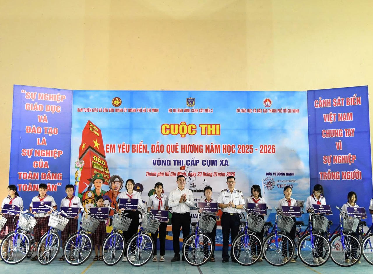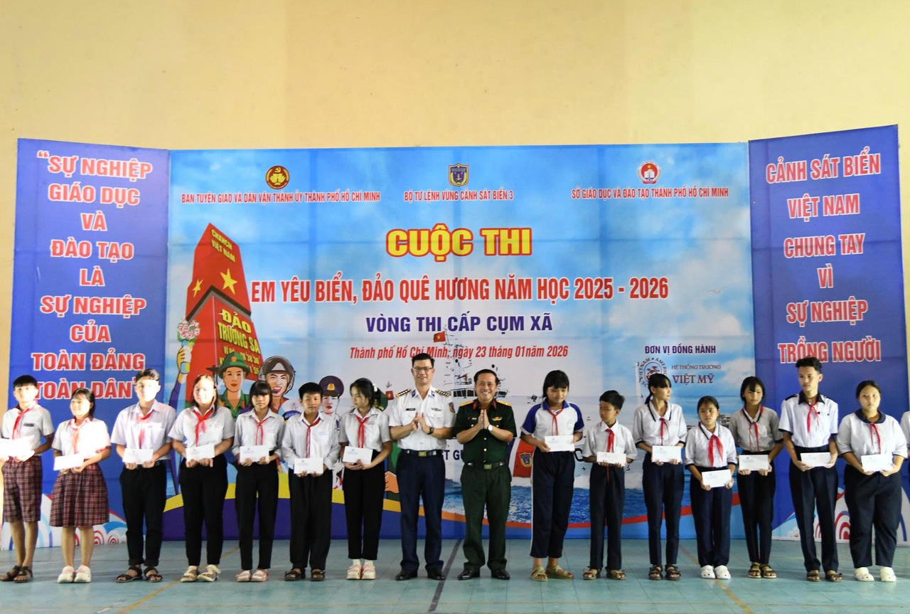 Tại xã Cần Giờ (TP HCM), Bộ Tư lệnh Vùng Cảnh sát biển 3 vừa mới phối hợp với Ban Tuyên giáo và Dân vận Thành ủy, Sở Giáo dục và Đào tạo TP HCM tổ chức phần thi trực tiếp Cuộc thi “Em yêu biển, đảo quê hương” năm học 2025 - 2026 dành cho học sinh trung học cơ sở các xã ven biển.