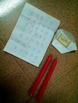 Tiếp đó, Thầy Hai lấy tờ giấy ra viết lên đó vài chữ, rồi lấy 4 điếu thuốc đang cháy khua qua lại trên tờ giấy vừa lẩm bẩm... kiểu người cúng không thuộc văn điếu. Dị thường hơn, sau khi đọc thần chú, “Thầy” lấy ra tờ tiền mệnh giá 1.000 đồng đặt trong tờ giấy và gói lại đưa cho chúng tôi.