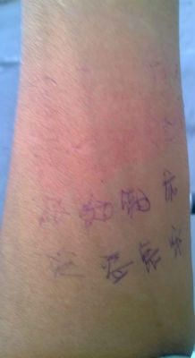 Nghi lễ tiếp theo, “Thầy” quay sang tôi (nữ phóng viên đang xâm nhập điều tra) và bảo: Sẽ làm phép vào cánh tay của tôi để tôi nói đứa em sẽ nghe lời. Vừa nói xong, “Thầy” vẽ lên tay tôi vài chữ và tiếp tục dùng điếu thuốc quơ trê tay tôi và lẩm bẩm.