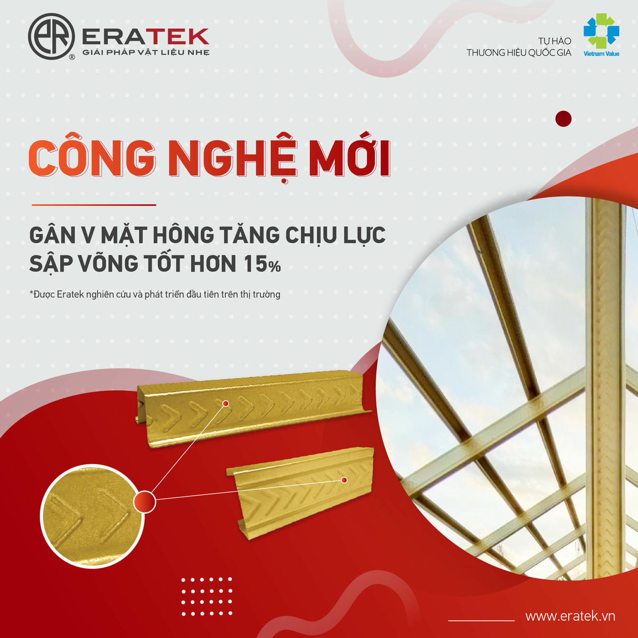 Không dừng lại ở đó, sau nhiều năm nỗ lực nghiên cứu và kiểm nghiệm, đến năm 2021 Eratek tiếp tục cho ra mắt thị trường kiểu dáng sản phẩm mới với bộ gân V tăng lực tĩnh tải tăng khả năng chịu lực sập võng cho sản phẩm tốt hơn 15% so với sản phẩm thép nhẹ không được cán gân V. Ngay khi ra mắt thị trường kiểu dáng sản phẩm mới đã chứng minh được ưu điểm khi nhận được những phản hồi tích cực từ hệ thống đại lý lắp đặt cũng như người tiêu dùng.