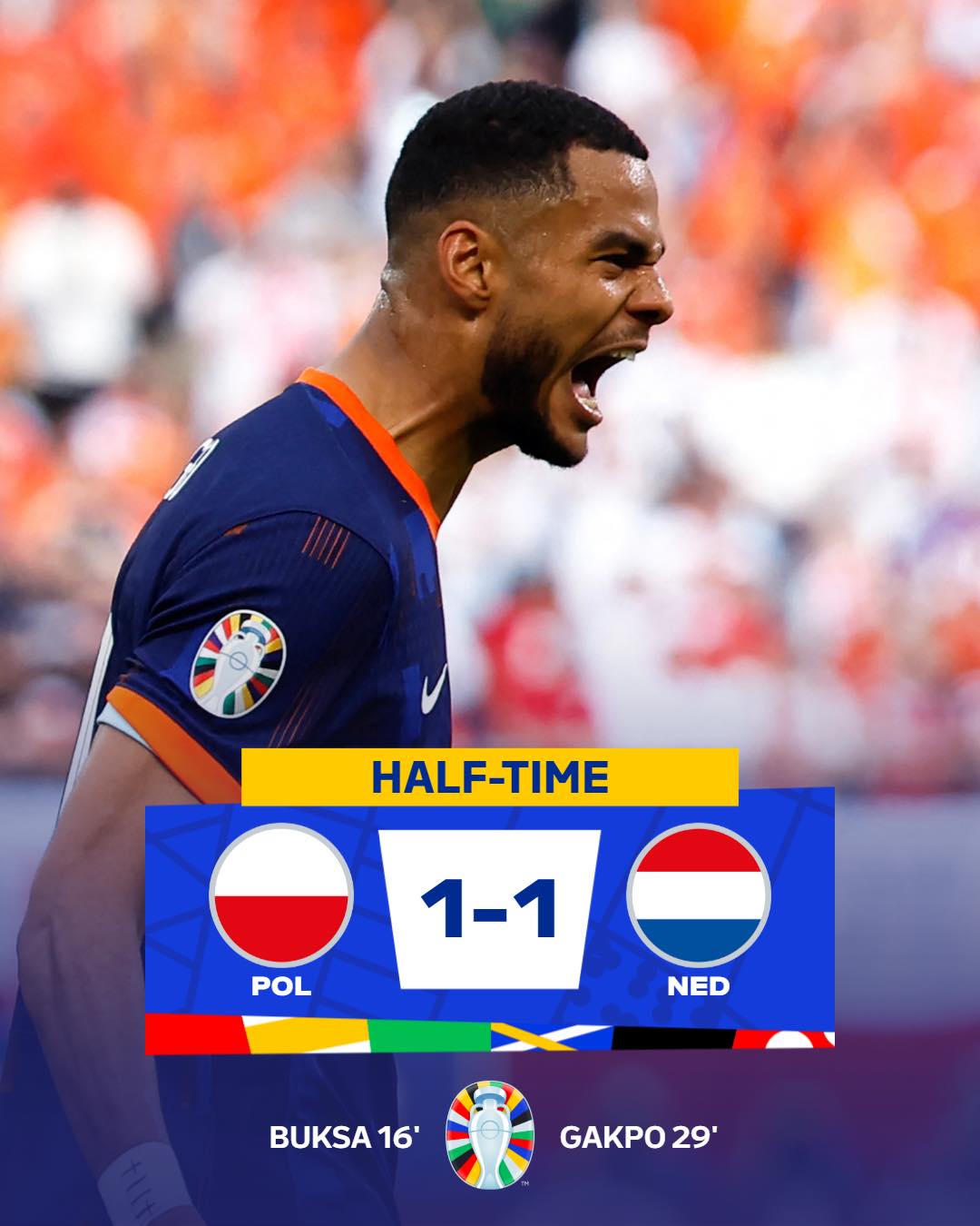 Phút 29, cú dứt điểm từ ngoài vòng cấm của Gakpo đã chạm chân hậu vệ Ba Lan đổi hướng khiến thủ thành Szczesny bất lực trong việc cản phá. Tỷ số được cân bằng 1-1.