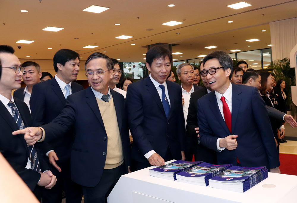 Phó Thủ tướng Vũ Đức Đam (ngoài cùng bên phải) tham quan gian hàng trưng bày sản phẩm Make in Viet Nam của EVN. |