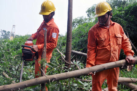 Ông Nguyễn Thành Trường - PGĐ Công ty Điện lực Sóc Sơn cho biết, quản lý chiều dài đường dây gần 500km chạy qua nhiều vùng đồi, rừng trồng cây keo nên công tác phát quang hành lang lưới điện được Điện lực Sóc Sơn triển khai thường xuyên, trong kế hoạch định kỳ hàng tháng và trong thời gian cao điểm mưa bão thì được phân thành các chu kỳ hàng ngày trong tuần để thực hiện nhiệm vụ chặt cây trong hành lang và cây ngoài hành lang có nguy cơ đổ vào đường dây.