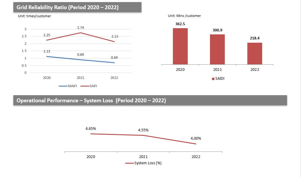 Các chỉ tiêu về độ tin cậy cung cấp điện, giảm tổn thất điện năng cũng được EVNCPC thực hiện tốt. Đến năm 2022, các chỉ số SAIFI (số lần mất điện trung bình), MAIFI (số lần mất điện thoáng qua) đã giảm về tương ứng ở mức 2.13 và 0.69 lần/khách hàng; chỉ số SAIDI (thời gian mất điện trung bình) giảm còn 218.4 phút/khách hàng; tổn thất điện năng đã giảm thấp về ở mức 4.0%.