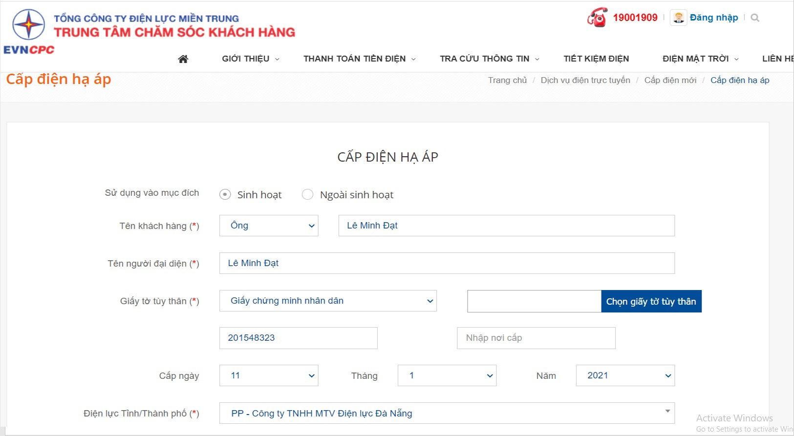Ngày 26/5/2021, anh Trần Hữu Hiền - khách hàng tại quận Hải Châu, TP. Đà Nẵng - đã hoàn thành hợp đồng cấp điện khi tiến hành xây nhà mới. Sau khi đăng ký mua điện ngày 25/5/2021, nhân viên Điện lực đã hoàn thành cấp điện trong ngày 26/5/2021. Sau khi hoàn tất cấp điện mới, Trung tâm chăm sóc khách hàng đã gọi điện để khảo sát chất lượng dịch vụ, anh Hiền đánh giá rất hài lòng với thời gian tiếp nhận, giải quyết của nhân viên Điện lực.