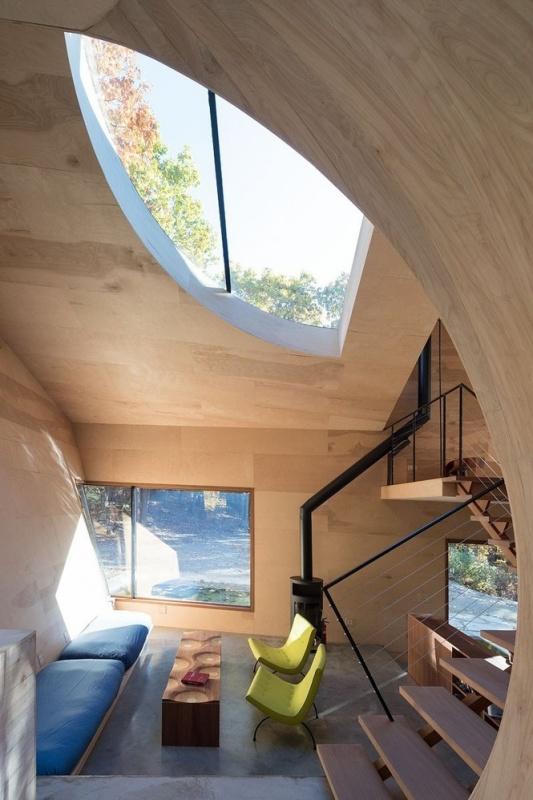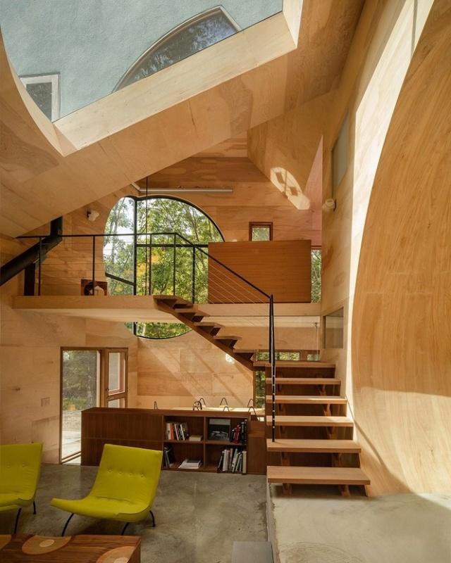 Đứng từ mọi phòng, mọi góc trong nhà gỗ, bạn đều có thể chiêm ngưỡng cảnh quan núi rừng xanh mát bên ngoài thông qua hệ cửa kính hình bán nguyệt đẹp mắt. |