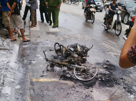 (PLO) - Chiếc xe máy vừa mua được hơn 1 tuần, khi đang lưu thông thì bất ngờ phát hỏa bốc cháy ngùn ngụt giữa phố, chỉ vài phút sau đã thành bộ khung sắt trơ trụi.