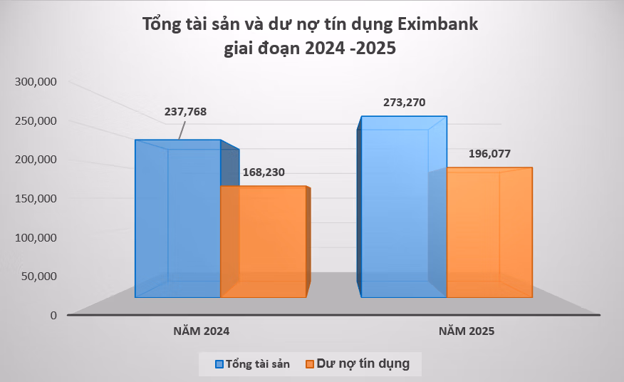 Tại ngày 31/12/2025, tổng tài sản Eximbank đạt 273.270 tỷ đồng, tăng 13,97% so với đầu năm. Nguồn vốn huy động đạt 242.669 tỷ đồng, tăng 15,52% so với đầu năm. Dư nợ cấp tín dụng đạt 196.077 tỷ đồng, tăng 16,55% so với đầu năm. Tỷ lệ nợ xấu được kiểm soát ở mức dưới 3%. Sự tăng trưởng đồng thời của tổng tài sản, huy động và tín dụng cho thấy vai trò ngày càng rõ nét của Eximbank trong việc dẫn vốn cho nền kinh tế, đồng hành cùng doanh nghiệp và người dân trong chu kỳ phục hồi và tăng trưởng mới của nền kinh tế.