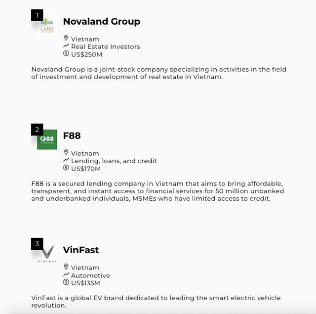 Dựa trên số vốn mà các công ty này đã huy động được, TechinAsia xếp hạng từ thấp đến cao, trong đó, doanh nghiệp huy động vốn tốt nhất đạt 250 triệu USD và thấp nhất là 20 triệu USD.