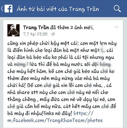 Điều đáng lo hơn là trên trang cá nhân của mình, cô người mẫu này có đến hàng chục ngàn người hâm mộ. Sẽ không đến nỗi nào nếu các fan của Trang Trần đủ tỉnh táo để phân biệt phải - trái, đúng - sai. Nhưng theo dõi các chia sẻ của Trang Trần có thể thấy fan của cô ủng hộ thần tượng đến thế nào trong cuộc… chửi bậy. Thần tượng chửi một, fan chửi tục thêm mười. Thần tượng bị mếch lòng, fan lập tức truy cả tông tích gia đình của khổ chủ lên, chia sẻ hình ảnh và chửi rủa không tiếc lời như chửi chính kẻ thù của mình vậy.