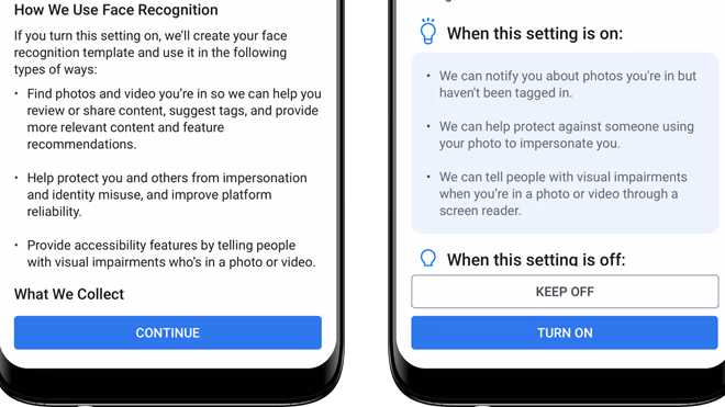 Tùy chọn này được đặt tên là “Nhận diện khuôn mặt" (face recognition) chứ không phải gợi ý thẻ như trước, theo mặc định nó sẽ ở trạng thái tắt. Sau khi tải ảnh lên, Facebook sẽ đưa ra thông báo hỏi xem người dùng có muốn kích hoạt không. Nếu kích hoạt, Facebook sẽ gửi thông báo cho bạn mỗi khi ai đó tải ảnh của họ lên mà trong đó có mặt bạn, kể cả khi họ không gắn thẻ.
