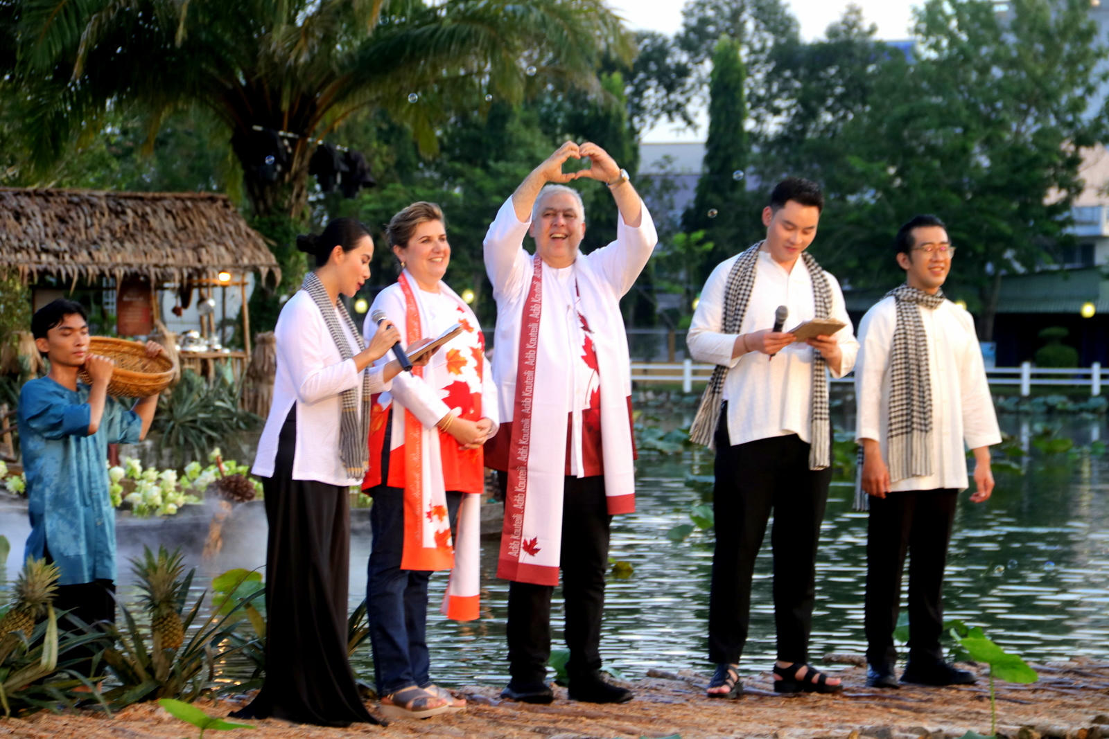 Ngài Hynek Kmonicek, Đại sứ đặc mệnh toàn quyền Cộng Hòa Czech cùng phu nhân và con trai rạng rỡ và hào hứng trình diễn áo bà ba. Điểm nhấn ấn tượng trên chiếc áo hai vị khách này là những hình ảnh, địa danh nổi tiếng của Cộng Hòa Czech. Tương tự ông Kouteili Adib và bà Kouteili Rima Issa - hai vị CEO đến từ Canada trình diễn áo bà ba với những họa tiết hình ảnh lá phông biểu tượng của Canada.
