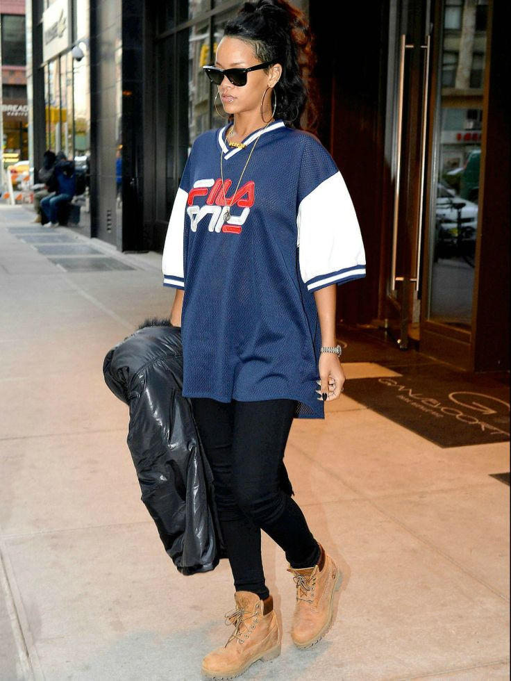 Rihanna cũng không bỏ qua xu hướng áo thun in logo của Fila khi xuống phố. Cô thể hiện tư duy sáng tạo qua cách mix&match cùng mẫu combat boots hầm hố và áo phao ấm áp.