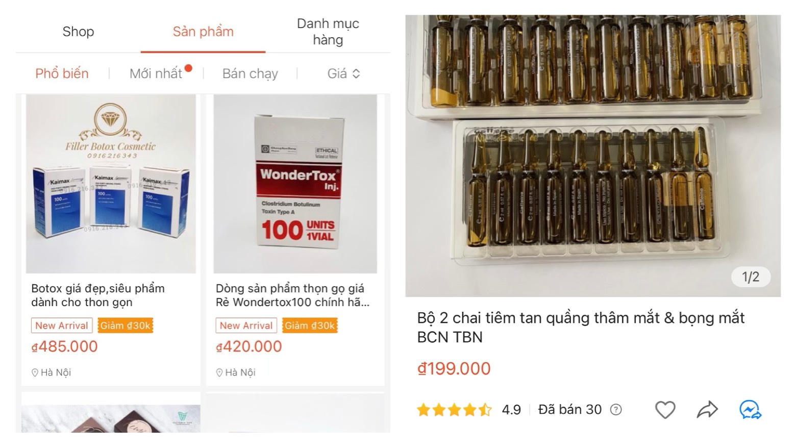 Một số loại phổ biến, được bán nhiều trên các sàn thương mại điện tử này có thể kể đến như: "Tinh chất làm đầy EPTQ chính hãng" giá 349.000 đồng; Tinh chất tiêm tan quầng thâm mắt & bọng mắt BCN TBN giá 199.000 đồng; Botox thon gọn Wondertox100 giá 420.000 đồng