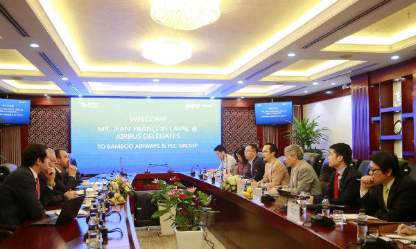 (PLO) - Ngày 6/3, Tập đoàn FLC và Hãng sản xuất máy bay Airbus của Pháp có buổi làm việc tại trụ sở FLC, xoay quanh thỏa thuận hợp tác mua máy bay liên quan đến hãng hàng không Bamboo Airways.