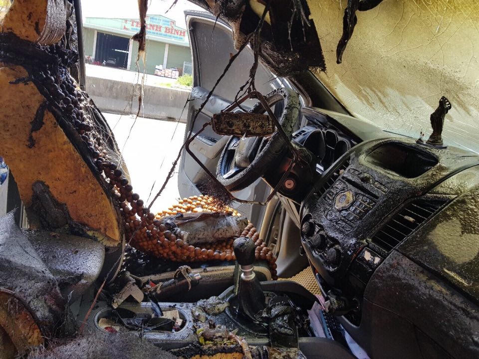 Cụ thể, theo phản ánh của bạn đọc, vào khoảng 11h ngày 04/10/2017, ông Duy dừng xe, tắt máy và khóa tất cả các cửa xe trước bưu điện Hàm Cường, Km 15, Quốc lộ 1A, xã Hàm Cường, Huyện Hàm Thuận Nam, tỉnh Bình Thuận. Sau 20 phút, ông Duy trở ra xe thì phát hiện khói bốc lên từ mép cửa sau hai bên. Sau đó, ông Duy cùng người dân dùng nước dập tắt đám cháy trên xe, sau 5 phút thì đám cháy được dập tắt hoàn toàn.