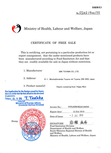 Xác nhận tiêu chuẩn chất lượng của cơ quan y tế Nhật Bản – nơi sản phẩm được sản xuất |