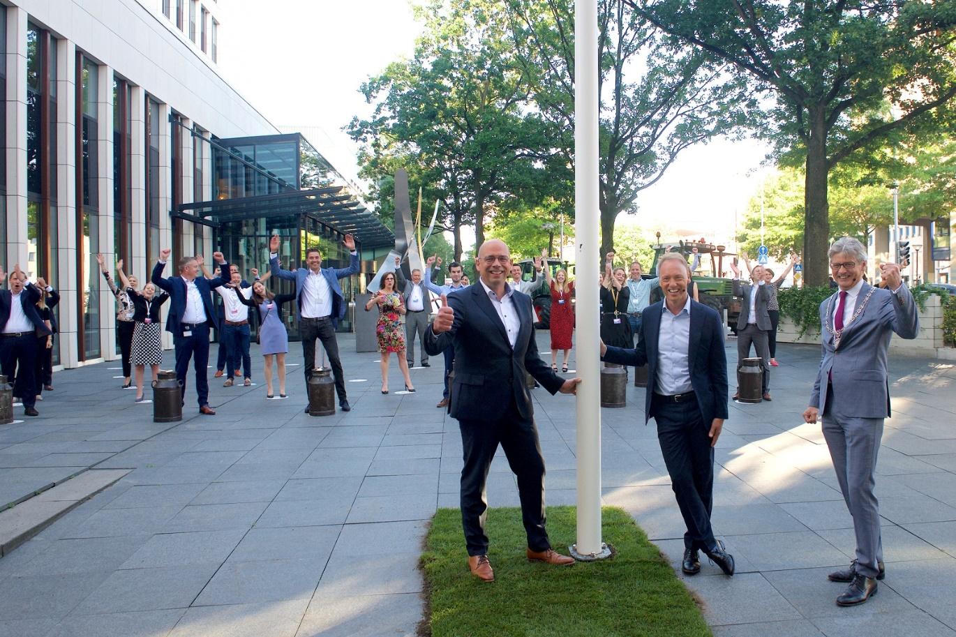 Chủ tịch Erwin Wunnekink (trái) CEO Hein Schumacher (giữa), và ông Lucas Bolsius, thị trưởng Amersfoort (phải), trong lễ kéo cờ kỷ niệm 150 năm thành lập tập đoàn FrieslandCampina. |