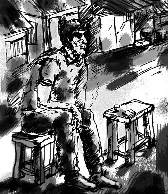 Giữa phố có một quán cóc nho nhỏ kê ghế đẩu cũ kỹ. Và thu lu trước quán là một người khách duy nhất, một gã đàn ông mà thoạt nhìn người ta đã có thể đoán ngay được thân thế. Hắn có bộ dạng hôi hám và rách mướp của một kẻ cả thế kỷ nay chưa được bước chân vào nhà tắm công cộng để thay ra một bộ quần áo mới. Gò má hóp lại. Râu ria xù xì không cạo và hốc mắt trũng sâu gắn hai con ngươi luôn đảo qua đảo lại cảnh giác.