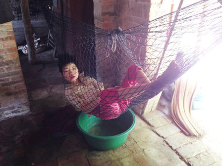 Theo anh Hiệp: “Cháu không ý thức được gì, thả ra là quậy phá khắp nơi. Vớ được gì là đập phá hết hoặc lao vào tường để đập đầu. Chuyện bị thương xảy ra như cơm bữa. Mấy năm trước bố mẹ tôi khỏe, còn để ý cháu được. Bây giờ đành cho cháu nằm võng “treo” lên, lúc ăn uống thì “thả” ra. May mắn là cháu bị vậy nhưng không ốm đau gì khác”.Ba bố con anh thuộc diện hộ nghèo tại địa phương. Mỗi tháng, cô con gái lớn được 520 ngàn tiền trợ cấp bệnh tật.