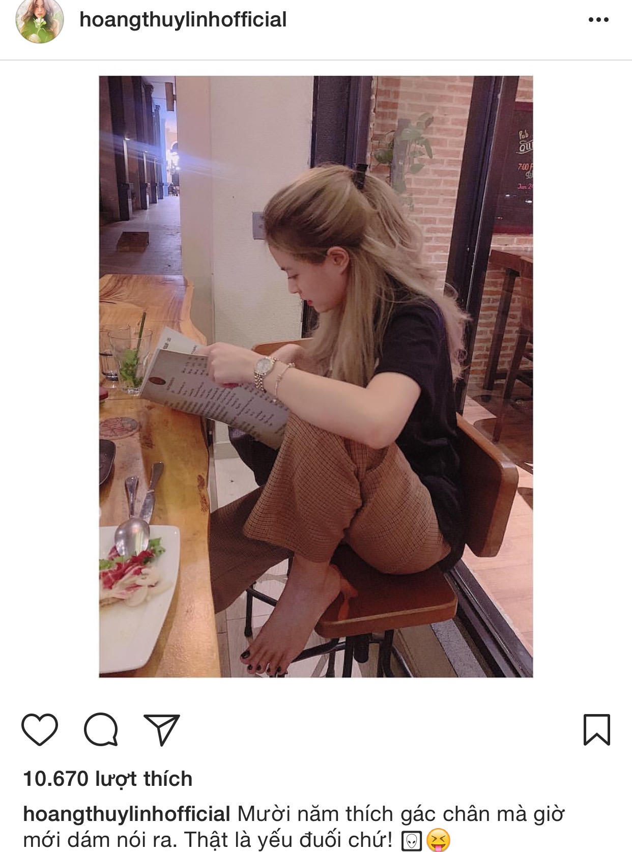 Mặc dù bị chỉ trích gay gắt nhưng sau đó Hoàng Thùy Linh vẫn tiếp tục đăng ảnh gác chân lên ghế khi đi ăn kèm theo dòng chia sẻ: “Mười năm thích gác chân mà giờ mới dám nói ra. Thật là yếu đuối chứ!”.