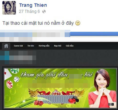 Missteen 2012 Thu Trang cũng từng có lần ngỡ ngàng khi thấy hình ảnh của mình xuất hiện trên một quảng cáo game… đánh bài. Cô khá bức xúc nhưng cũng đã không còn xa lạ với việc bị mạo danh, mượn hình ảnh không xin phép trên mạng.