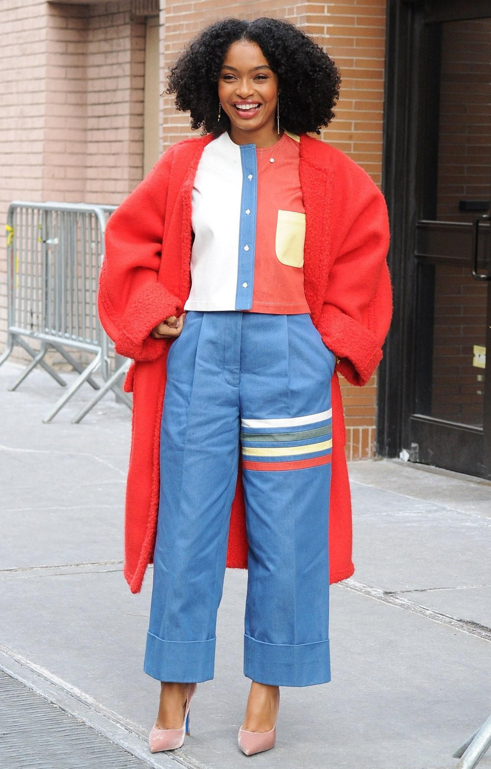 Nữ diễn viên Yara Shahidi lăng xê phong cách color block với sự kết hợp giữa hai tông màu nổi bật là xanh denim và đỏ cam. Ngoài ra một số chi tiết trên áo và quần có thêm điểm nhấn bởi tông vàng, trắng để làm nổi bật hơn bộ trang phục.