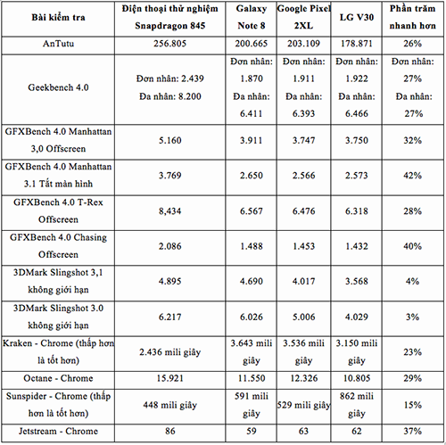 Sau khi vi xử lý Snapdragon 845 ra mắt, trang công nghệ Cnet cũng đã có thử nghiệm đo hiệu năng của vi xử lý này, đồng thời so sánh với Galaxy Note8, Pixel 2 XL và LG V30 - ba model chạy Snapdragon 835 - để so sánh hiệu suất. Trước đó, Qualcomm cho biết hiệu năng chip mới cao hơn 25% so với chip cũ.