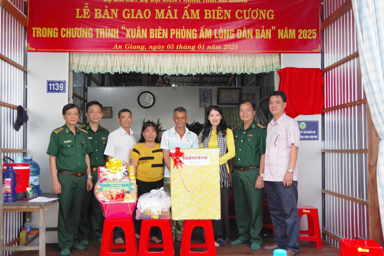 Theo đó, Bộ đội Biên phòng tỉnh An Giang đã tổ chức thăm, chúc Tết, tặng 327 phần quà (trị giá 150,5 triệu đồng) và 15 triệu đồng tiền mặt; tặng 2 căn nhà “Mái ấm biên cương” (trị giá 120 triệu đồng); tặng 50 đòn bánh tét, 1.000kg gạo, 50 ảnh Bác Hồ, 100 lá cờ Tổ quốc (trị giá 25,5 triệu đồng) cho các hộ nghèo, cận nghèo, hộ gia đình chính sách, hộ có hoàn cảnh khó khăn, các cháu trong Chương trình “Nâng bước em tới trường - Con nuôi Đồn Biên phòng”, “Mẹ đỡ đầu” và các em học sinh nghèo hiếu học ở khu vực biên giới. Tổng trị giá các hoạt động là 311 triệu đồng.
