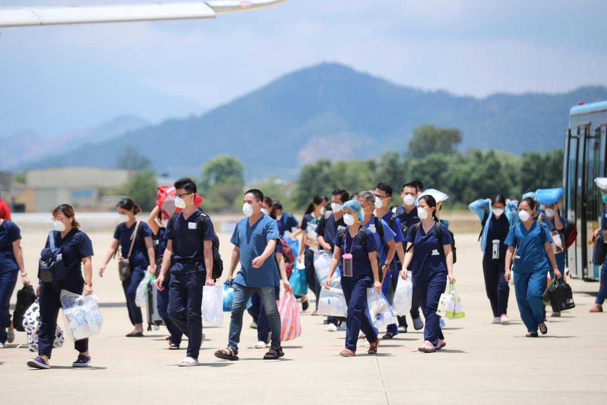 Chiều 27/7, Vietnam Airlines phối hợp cùng Công ty Cổ phần Khai thác nhà ga quốc tế Đà Nẵng (AHT) thực hiện chuyến bay mang số hiệu VN129 đưa gần 200 y bác sĩ thuộc các tỉnh miền Trung nên trên và đoàn y, bác sĩ Bệnh viện Trung ương Huế (tỉnh Thừa Thiên Huế), khởi hành từ Đà Nẵng vào TP. HCM để chi viện chống dịch cho các tỉnh thành phía Nam.
