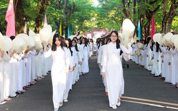 Nữ sinh trường THPT Hai Bà Trưng (Huế) xếp hàng dài đón chào học sinh lớp 10