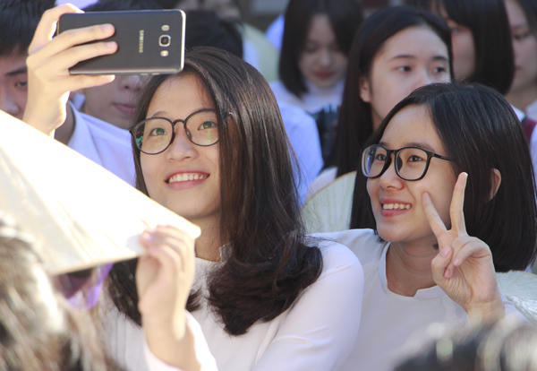 Phía dưới sân trường, nữ sinh tranh thủ chụp ảnh, ghi lại khoảnh khắc ngày khai trường. Ảnh: Võ Thạnh