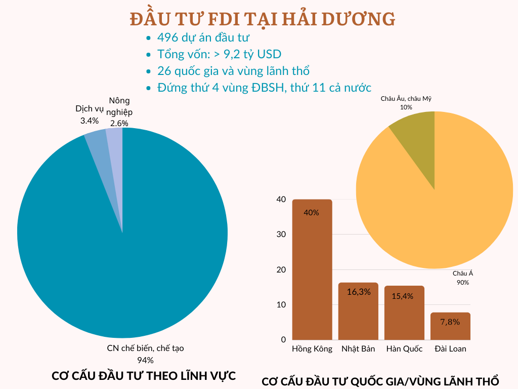 Những năm gần đây, vốn FDI chiếm từ 35% đến 40% cơ cấu vốn đầu tư toàn xã hội trên địa bàn tỉnh. Với trên 90% tổng vốn đầu tư nước ngoài thuộc lĩnh vực công nghiệp chế tạo, các doanh nghiệp (DN) FDI hiện đang đóng góp trên 60% giá trị sản xuất công nghiệp tại Hải Dương, thúc đẩy chuyển dịch cơ cấu kinh tế, góp phần nâng cao năng lực sản xuất công nghiệp trên địa bàn tỉnh,