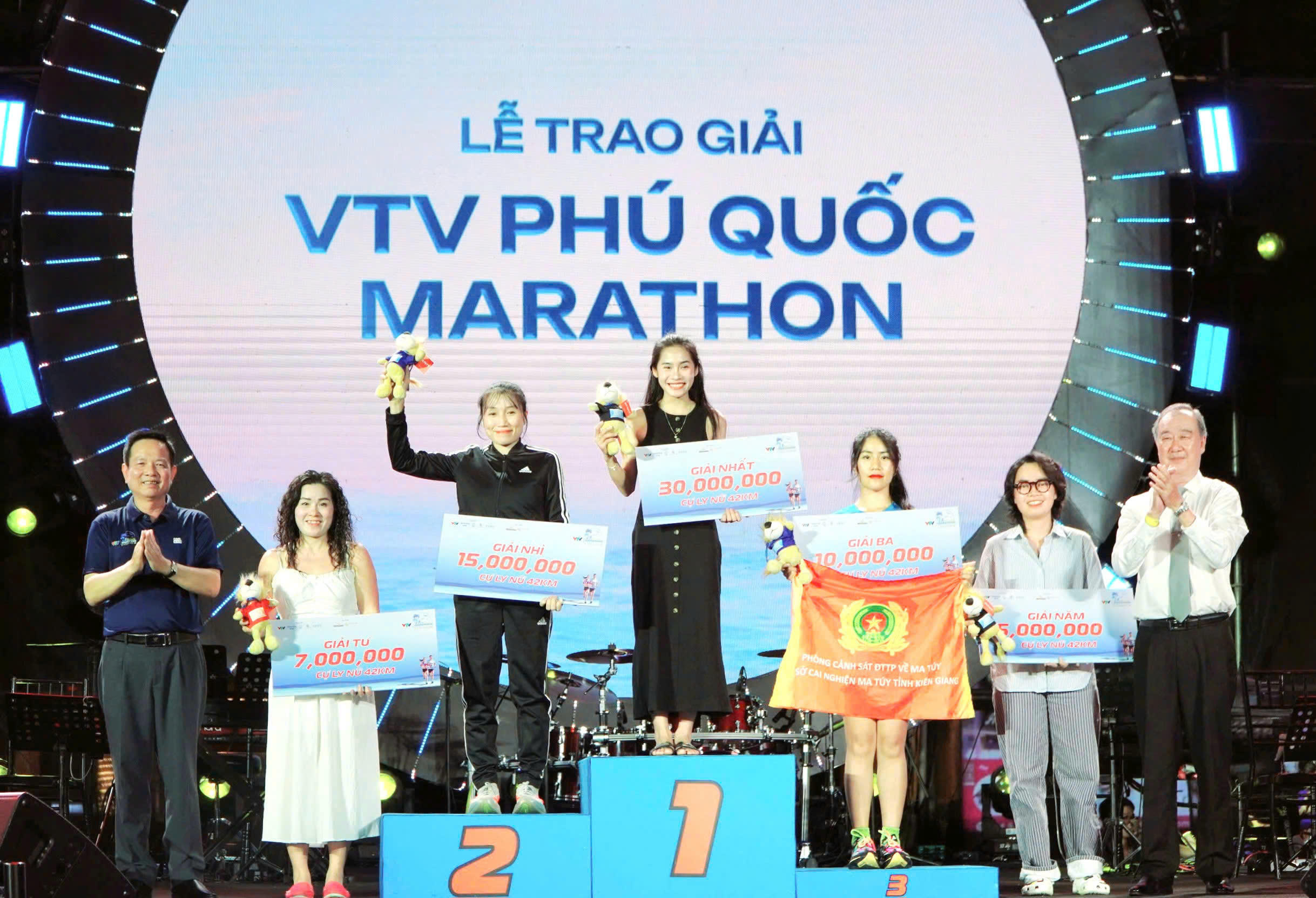 Ông Trần Minh Khoa - Chủ tịch UBND TP Phú Quốc và ông Đỗ Thanh Hải - Phó Tổng giám đốc thường trực Đài Truyền hình Việt Nam (VTV) trao giải cho các vận động viên đoạt giải cự ly 42km nam. |