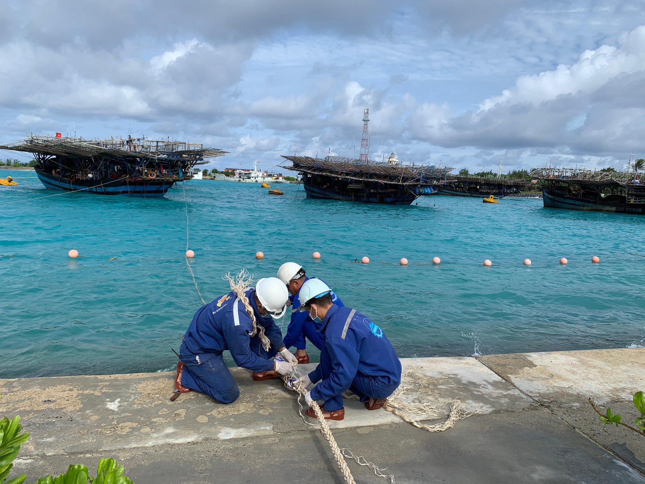 Nhân viên Trung tâm dịch vụ hậu cần - kỹ thuật đảo Sinh Tồn giúp ngư dân gia cố dây buộc tàu. Ảnh: Trung Kiên |