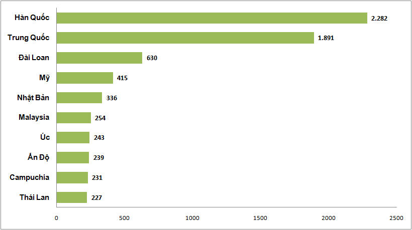 Các thị trường trong top 10 còn lại gồm Đài Loan, Mỹ, Nhật Bản, Malaysia, Úc, Ấn Độ, Campuchia, Thái Lan.