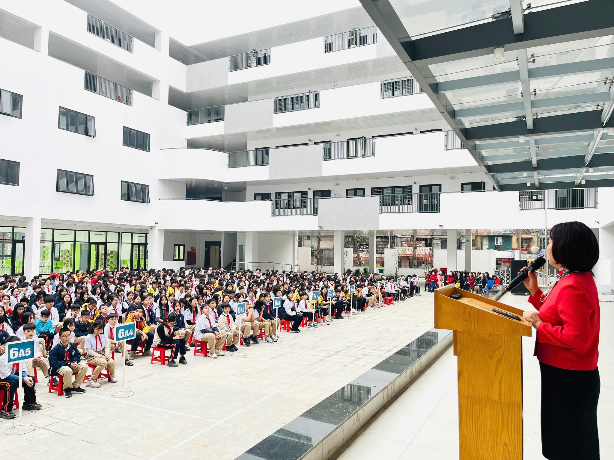 Thầy trò trường PTCS Khương Thượng trong buổi sinh hoạt chung đầu tiên trong ngôi trường mới. Ảnh: TKT |