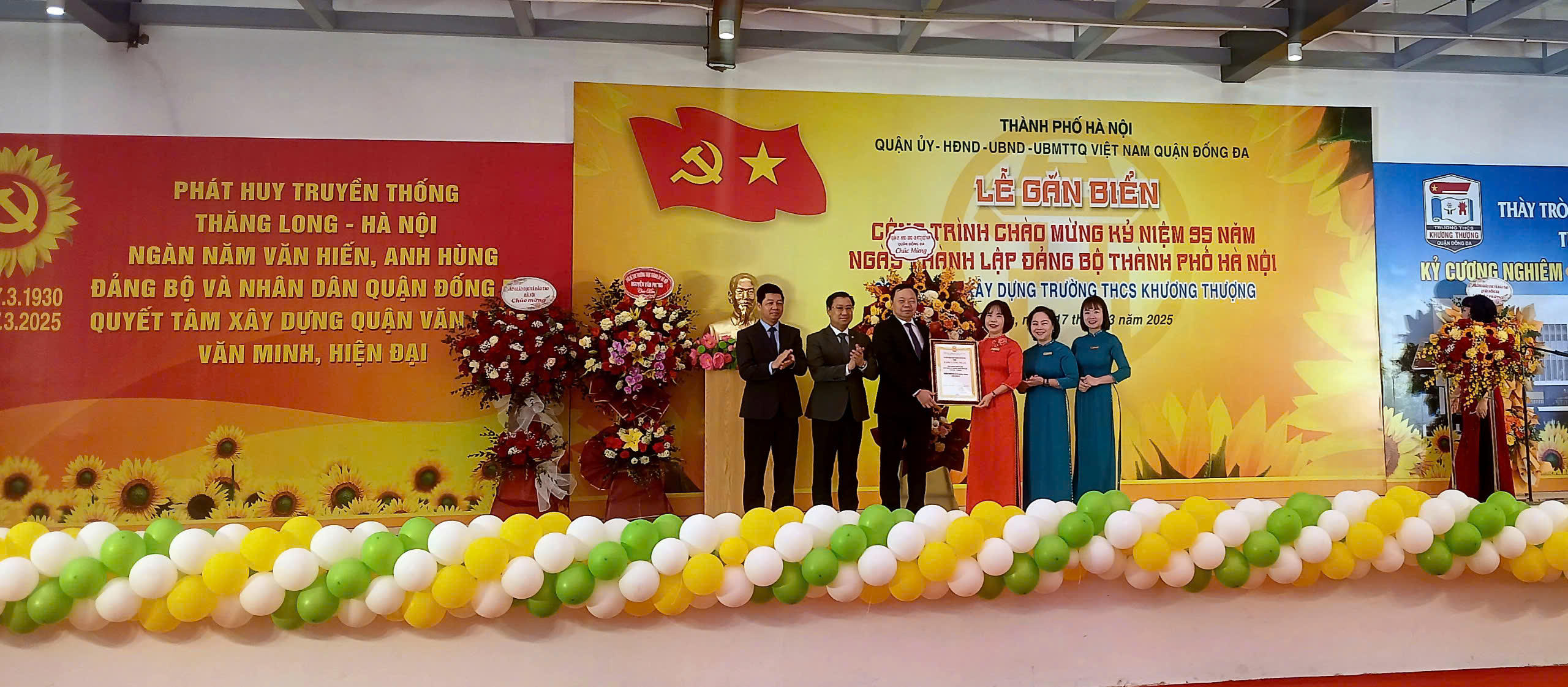 (PLVN) - Sáng 17/3, tại Trường THCS Khương Thượng (Đống Đa, Hà Nội), Quận ủy, HĐND, UBND Ủy ban MTTQ quận Đống Đa (Hà Nội) đã long trọng tổ chức lễ gắn biển công trình Trường PTCS Khương Thượng là công trình chào mừng “Kỷ niệm 95 năm Ngày thành lập Đảng bộ TP Hà Nội (17/03/1930 - 17/03/2025)