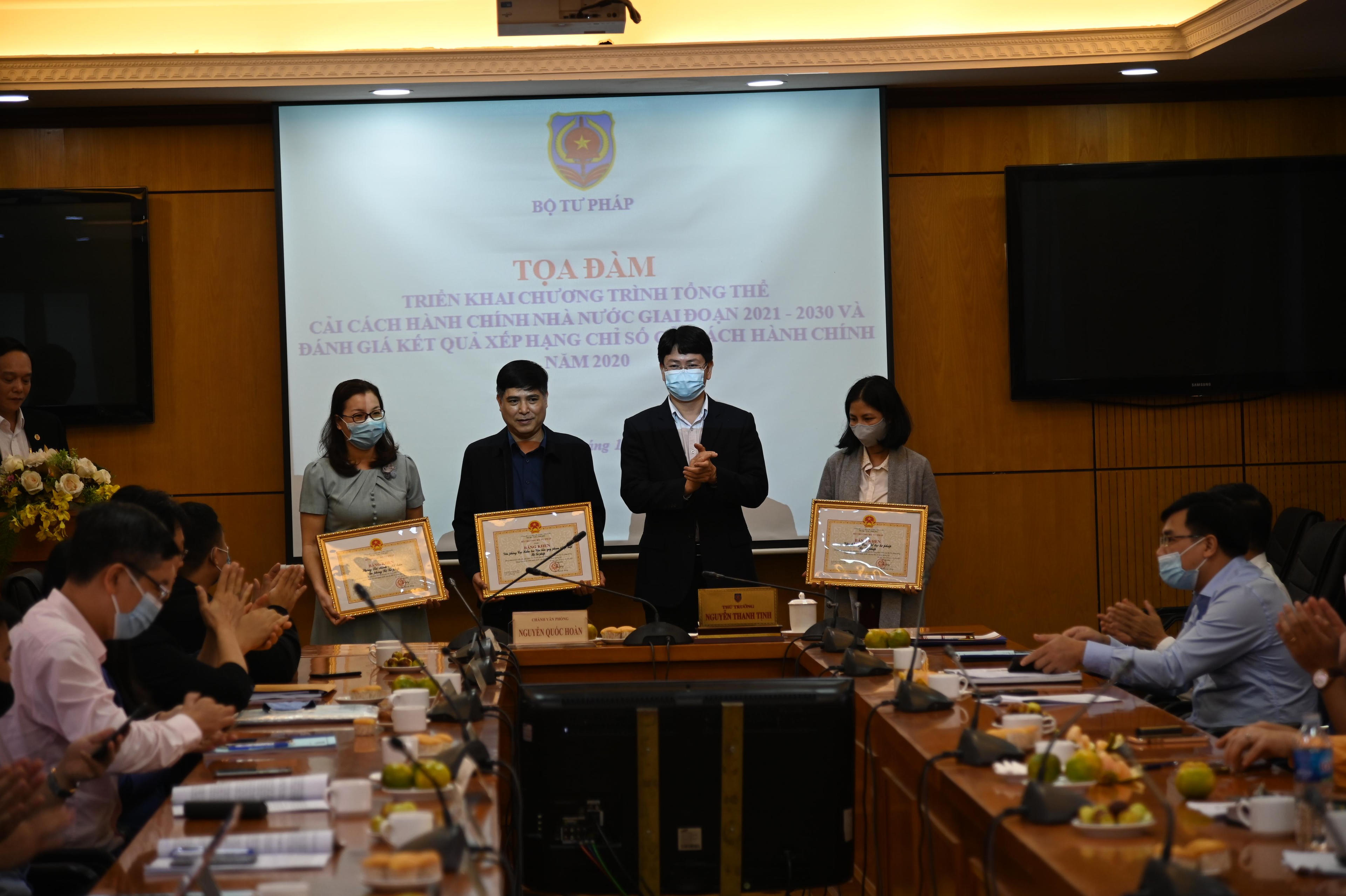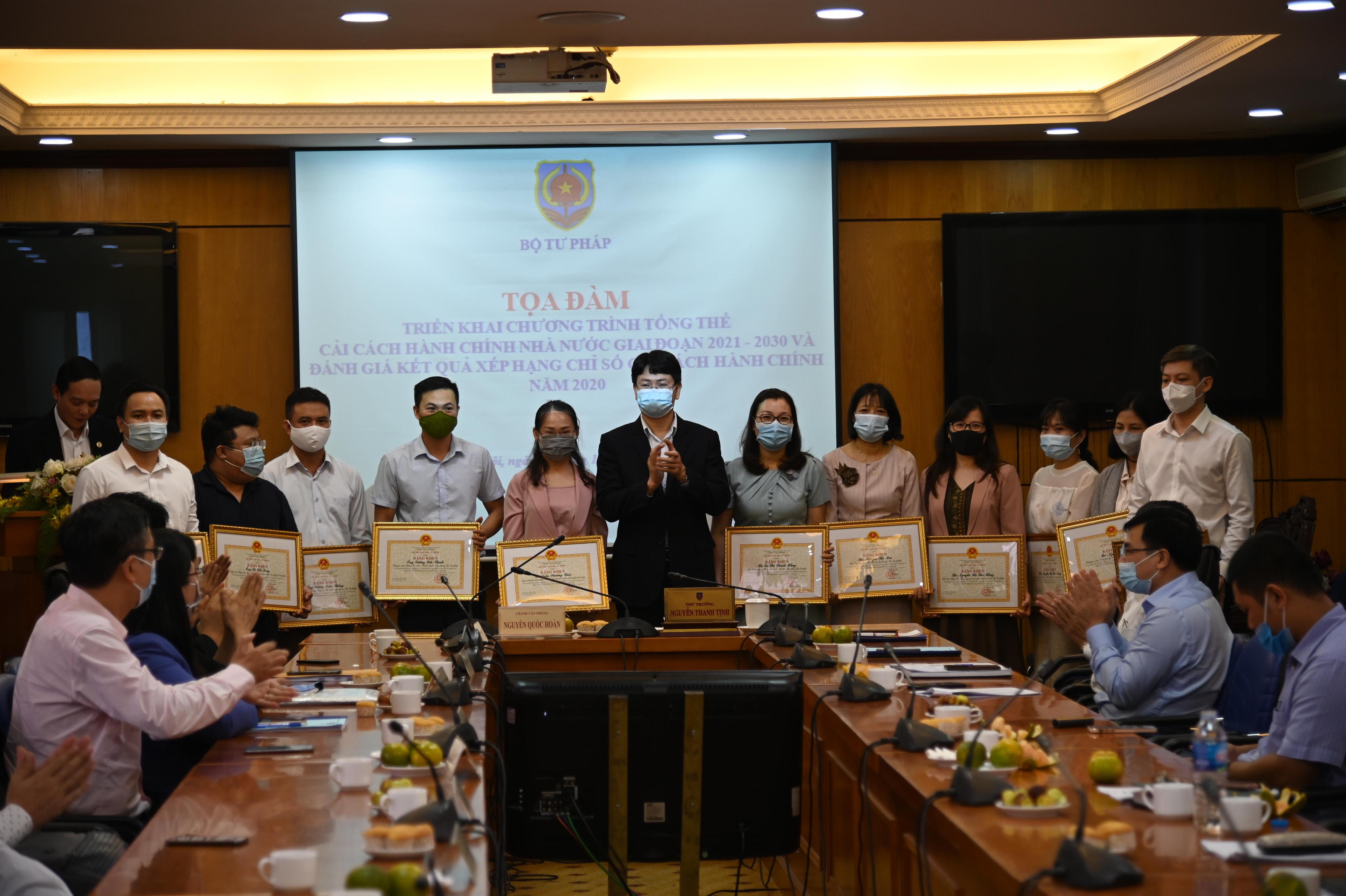 Nhân dịp này, Bộ Tư pháp đã công bố và trao Quyết định tặng Bằng khen của Bộ trưởng Bộ Tư pháp cho các tập thể, cá nhân có đóng góp cho Chỉ số CCHC của Bộ Tư pháp năm 2020.