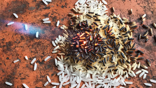 Anh Bình quả quyết đây là gạo giả vì gạo thật sẽ không có biểu hiện như vậy. Để chứng minh, anh Bình dùng một ít gạo loại bình thường và thực hiện thao tác tương tự. Phải mất trên 10 giây, số gạo này mới cháy đen và mùi không khó chịu như loại gạo đốt trước đó.