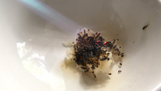 Nghi là gạo giả, anh Bình đã dùng lửa từ bình gas mini đốt một ít. Sau 3 giây đốt lên, gạo đã cháy đen, mùi hôi như nhựa, sau đó vón cục.
