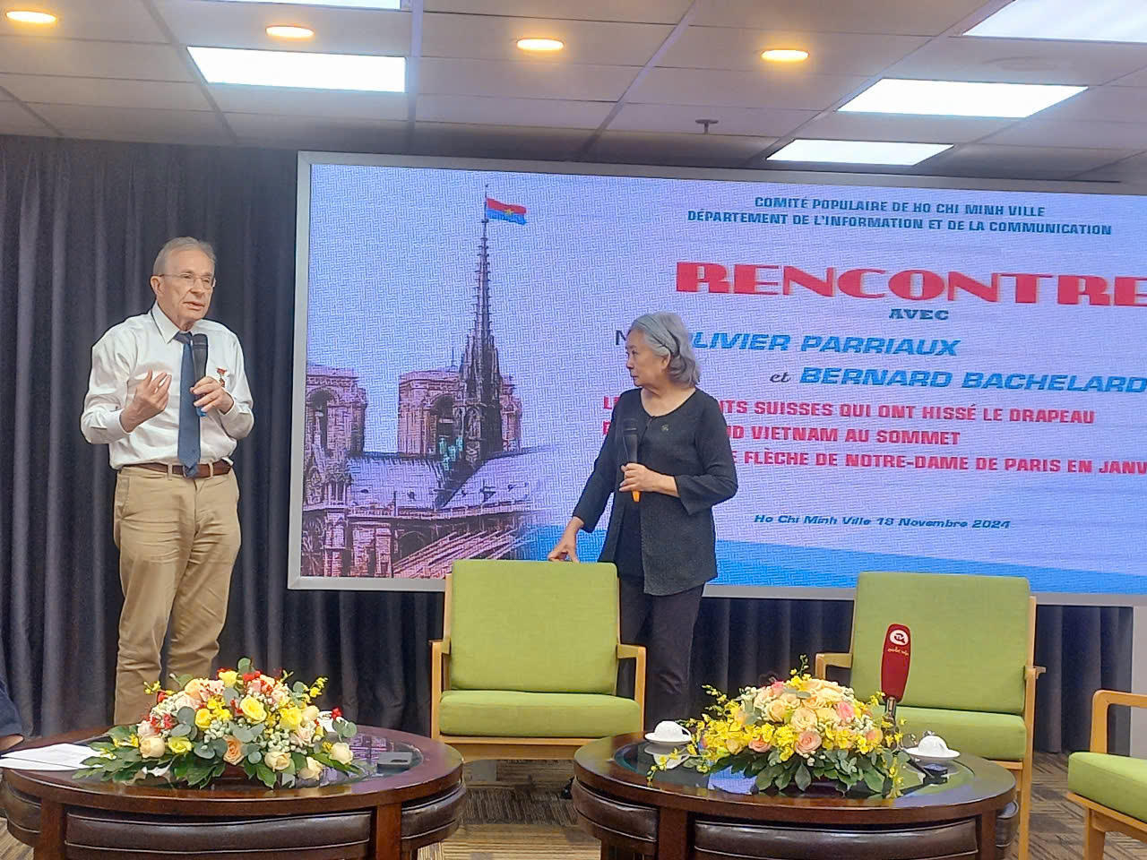 (PLVN) - Chiều 18/11, Sở Thông tin Truyền thông TPHCM tổ chức buổi gặp gỡ nhóm người treo cờ Mặt trận Dân tộc Giải phóng miền Nam Việt Nam (MTDTGPMNVN) trên đỉnh cao nhà thờ Đức Bà ở Paris (1969).