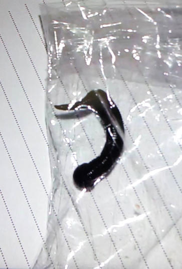 Con đỉa ra khỏi khí quản của cháu Sồng có chiều dài lúc no máu là 5cm còn bình thưởng là 10cm. Được biết, đây là trường hợp đầu tiên nhập viện có dị vật là con đỉa chui vào trong thanh quản.