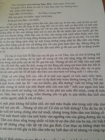 Chắc cô chú cũng biết, con vốn dĩ là một con người có tính cách hiền lành, năng động, vui vẻ, với biết bao ước mơ và dự định trên bước đường tương lai. Thế mà, chỉ một bước chân tội lỗi “ma xui khiến, quỷ dẫn đường”, tuổi trẻ bồng bột, dại khờ muốn chứng tỏ mình “một con ngựa non háu đá”, con đã đưa mình rơi xuống vực thẳm, tự tay phá tan cuộc đời mình, cướp đi tính mạng của Tâm, bao sự kỳ vọng, niềm thương yêu và gây ra quá nhiều đau khổ cho nhiều người, nhất là với cô chú.