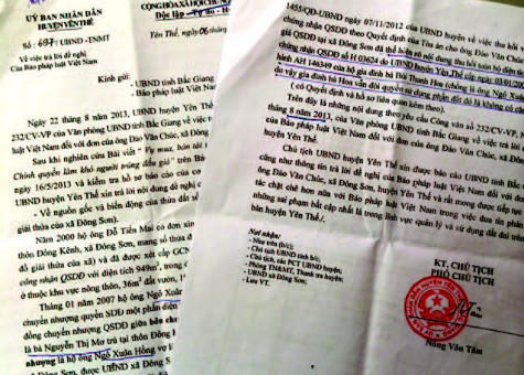 UBND tỉnh Bắc Giang đã có Văn bản số 232/CV-VP gửi UBND huyện Yên Thế yêu cầu giải trình nội dung truyền thông phản ánh. Ngày 6/9/2013, Chủ tịch UBND huyện Yên Thế có Công văn số 697/UBND-TNMT gửi UBND tỉnh Bắc Giang và Báo PLVN, trong đó khẳng định: “Tháng 1/2007, hộ ông Ngô Xuân Hồng, bà Bùi Thanh Hoa nhận chuyển nhượng quyền sử dụng đất (QSDĐ) của hộ ông Đỗ Tiến Mai và vợ là Nguyễn Thị Mơ, được UBND xã Đông Sơn chứng thực ngày 3/1/2007, với diện tích 313m2, trong đó quy hoạch thực tế chỉ có 237m2 đất ở và 76m2 thuộc đất hành lang đường giao thông”.