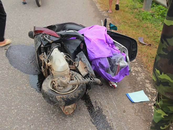 Cú va chạm mạnh khiến ông Khang ngã xuống đường, tử vong tại chỗ. Xe máy của nạn nhân biến dạng, hư hỏng nặng do bị kéo lê một đoạn. Chiếc ô tô gây tai nạn bị móp một phần đầu.