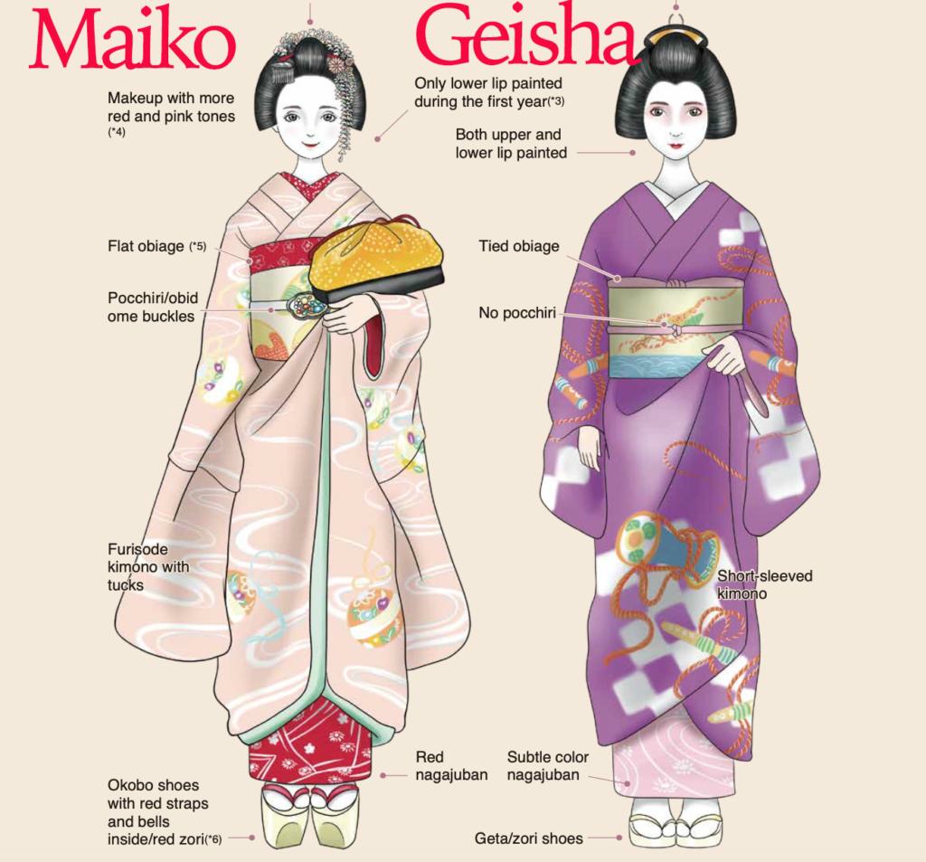 Như đã đề cập ở trên, những geisha đào tạo và làm việc ở Kyoto được gọi là geiko và geiko trẻ chưa hoàn thành khóa đào tạo được gọi là maiko. Việc đào tạo của một maiko thường bắt đầu ở độ tuổi 15-16 và họ sẽ không trở thành geiko cho đến khi hoàn thành khóa đào tạo 5 năm.