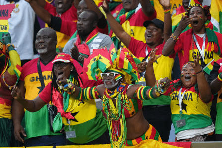 Cổ động viên Ghana vừa buồn bã khi bị gỡ hòa 2-2, bây giờ họ lại hò hét, nhảy múa trên khán đài, trong khi đó cổ động viên Hàn Quốc lại chết lặng.