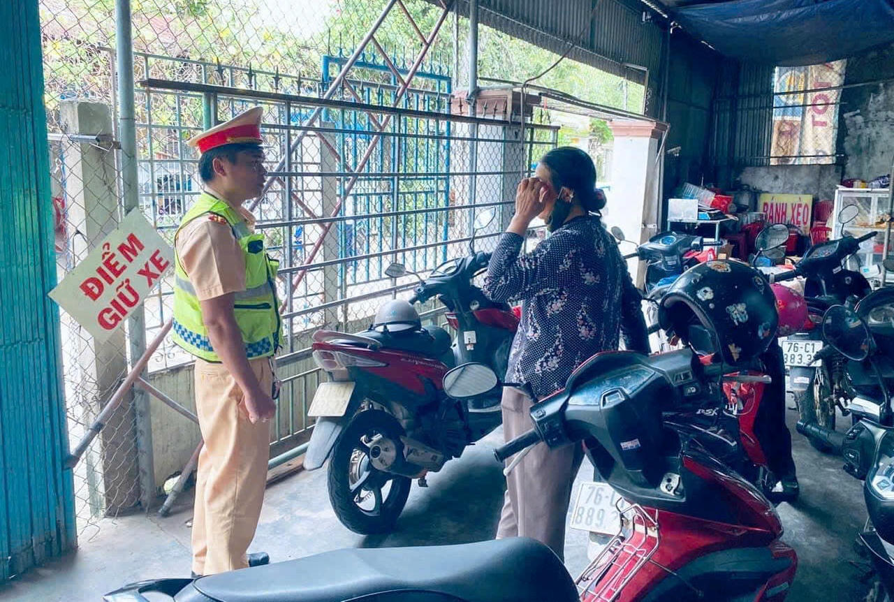 Công an tỉnh Quảng Ngãi thông tin, lực lượng CSGT Công an huyện Bình Sơn đã phối hợp với Công an thị trấn Châu Ổ và đại diện Trường THPT Bình Sơn tổ chức bí mật ghi hình và kiểm tra các bãi giữ xe bên ngoài Trường THPT Bình Sơn.
